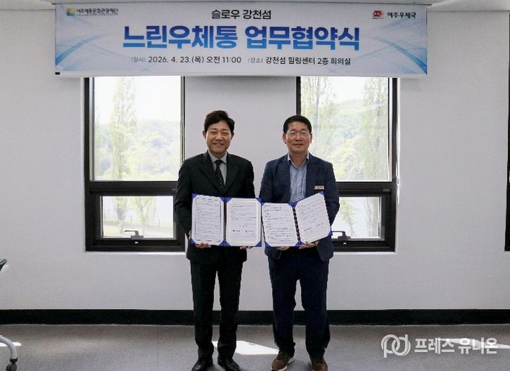 프레스유니온 김성길 기자 | 여주세종문화관광재단과 여주우체국은 4월 23일 강천섬 힐링센터에서 ‘슬로우 강천섬 느린우체통 업무협약(MOU)’을 체결했다. 빠르게 흘러가는 일상 속에서 잠시 걸음을 멈추고, 소중한 사람에게 미래의 마음을 전할 수 있는 감성 관광콘텐츠를 공동으로 운영하기 위해서다.