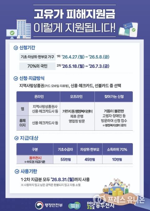 프레스유니온 강찬희 기자 | 동두천시가 중동발 고유가와 고물가로 인한 시민 부담을 완화하고 지역경제 회복을 지원하기 위해 ‘고유가 피해지원금’을 지급한다.