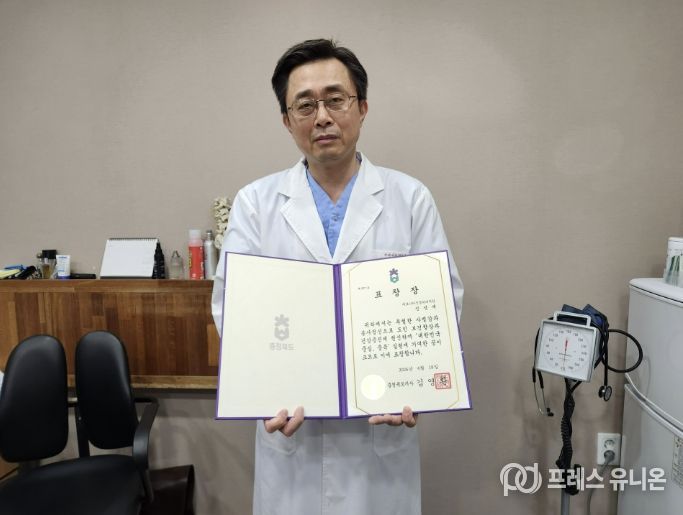 프레스유니온 김성길 기자 | 충주시 소재 베로니카신경외과의원 신성재 원장이 ‘제54회 보건의 날’ 기념행사에서 도민 보건 향상에 기여한 공로를 인정받아 충청북도지사 유공자 표창을 수상했다.