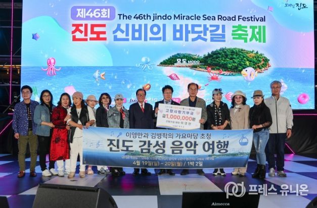프레스유니온 강찬희 기자 | 지난 19일 진도군 철마광장에서 열린 진도 신비의 바닷길 축제 ‘미라클 콘서트’ 행사에서 서울 은평치과의 대표원장인 이영만 박사가 고향사랑기부금 100만 원을 기부했다.