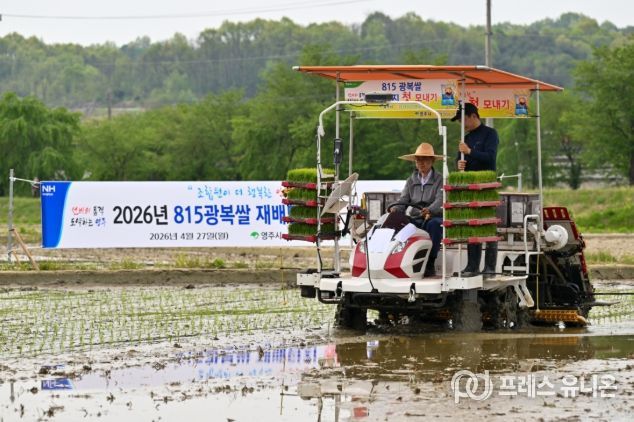 프레스유니온 강찬희 기자 | 영주시와 안정농협은 4월 27일 안정면 오계리 최이한 농가의 논에서 ‘2026년 8·15광복쌀 재배단지 첫 모내기 행사’를 개최했다고 밝혔다.