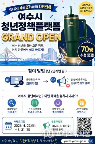 프레스유니온 강찬희 기자 | 여수시는 청년들에게 맞춤형 정책 정보를 제공하고 양방향 소통을 지원하기 위한 ‘여수시 청년정책 플랫폼’을 27일 정식 운영 개시하고, 이를 기념한 특별 이벤트를 진행한다고 밝혔다.