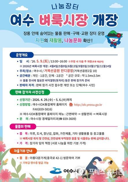프레스유니온 강찬희 기자 | 여수시는 오는 5월 9일 오후 1시부터 4시까지 거북선공원 잔디광장에서 ‘2026년 제2차 여수 벼룩시장’을 개최한다고 밝혔다.