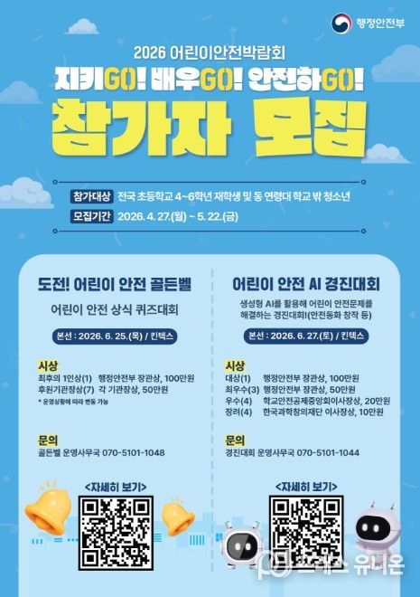 프레스유니온 강찬희 기자 | 행정안전부는 6월 25일부터 27일까지 경기도 고양시 킨텍스(KINTEX)에서 ‘2026 어린이안전박람회’를 개최한다. 올해 박람회는 ‘지키GO! 배우GO! 안전하GO!’를 표어로, 어린이가 올바른 안전의식과 습관을 익힐 수 있도록 다양한 체험 활동으로 구성했다.