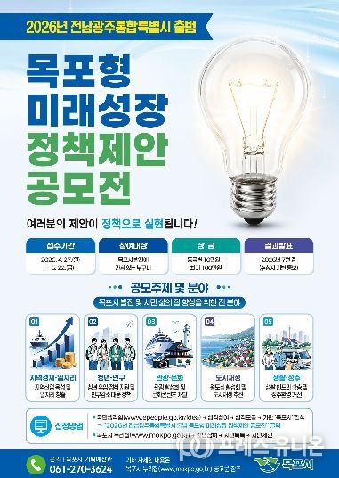 프레스유니온 강찬희 기자 | 목포시가 전남·광주 통합특별시 출범에 대비하고 지역의 미래 성장동력을 발굴하기 위해 ‘목포형 미래성장 정책제안 공모전’을 개최한다.