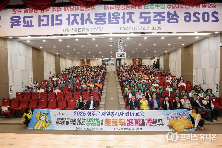 프레스유니온 강찬희 기자 | 경북 성주군자원봉사센터(센터장 이명진)는 지역 공동체의 따뜻한 변화를 이끄는 자원봉사 리더들을 한자리에 모아 의미 있는 교육의 장을 마련했다. 4월 24일 성주군청 대강당에서 열린 '2026 성주군 자원봉사자 리더 교육'은 단순한 역량 강화 교육을 넘어 나눔과 연대의 가치를 되새기고, 다가오는 지역 대표 축제를 함께 준비하는 결속의 자리로 깊은 울림을 전했다.