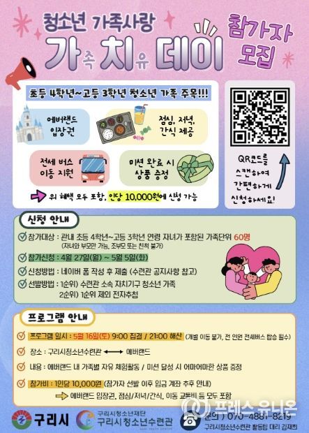 프레스유니온 김성길 기자 | 구리시청소년재단 청소년수련관은 가정의 달을 맞아 오는 5월 16일 관내 청소년 가족을 대상으로 ‘청소년 가족사랑 가치(가족치유)데이’를 운영하며, 참가 가족을 4월 27일부터 5월 5일까지 모집한다고 밝혔다.