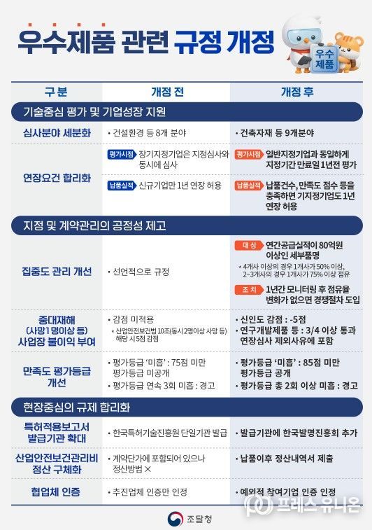 프레스유니온 강찬희 기자 | 조달청은 기업의 성장을 지원하고, 공정한 경쟁환경을 조성하기 위해 우수조달물품 관련 규정을 개정하여 4월 27일부터 시행한다고 밝혔다.
