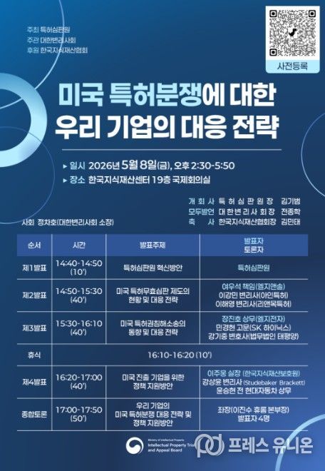 프레스유니온 강찬희 기자 | 지식재산처 특허심판원은 5월 8일 14시 30분 한국지식재산센터(서울 강남구)에서 우리 기업의 미국 특허분쟁 대응 역량 강화를 위해 '미국 특허분쟁에 대한 우리 기업의 대응전략' 발표회를 개최한다고 밝혔다.