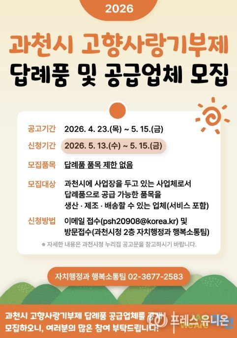 프레스유니온 김성길 기자 | 과천시는 고향사랑기부제 활성화를 위해 답례품 공급업체를 공개 모집한다고 밝혔다.