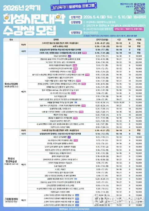 프레스유니온 김성길 기자 | 화성특례시는 2026년 화성시민대학 2학기 수강생을 오는 5월 4일부터 5월 10일까지 선착순으로 모집한다고 밝혔다.