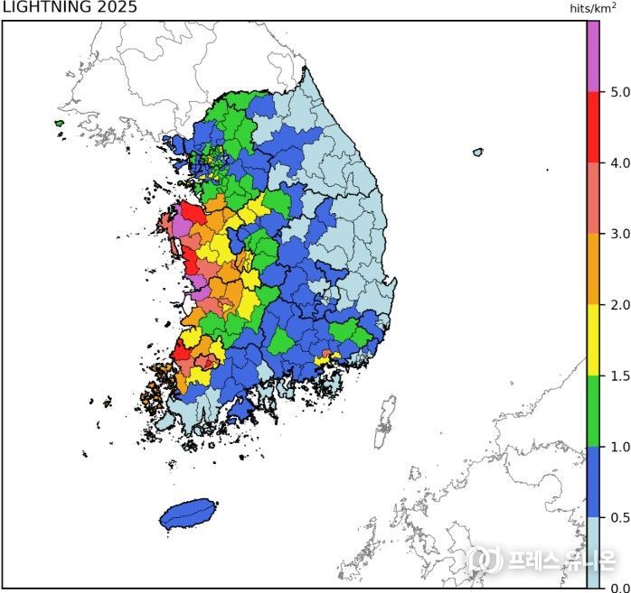 프레스유니온 강찬희 기자 | 기상청은 2025년 우리나라에서 관측된 낙뢰 정보를 담은 ‘2025 낙뢰연보’를 발간했다. 연보는 기상청 21개 낙뢰 관측망으로 관측한 자료를 통해 분석한 △월별, 광역시·도별, 시군구별 낙뢰 횟수 △단위 면적당(㎢) 횟수 △낙뢰 공간 분포 △주요 5대 낙뢰 사례 등의 내용을 담고 있다.