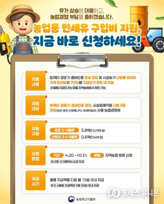 프레스유니온 강찬희 기자 | 농림축산식품부는 올해 추경예산에 반영된 농기계 3종 면세경유 유가연동보조금과 시설농가 난방용 면세유 유가연동보조금 지원 신청·접수중(4월 20일~10월 31일)에 있다고 밝혔다.