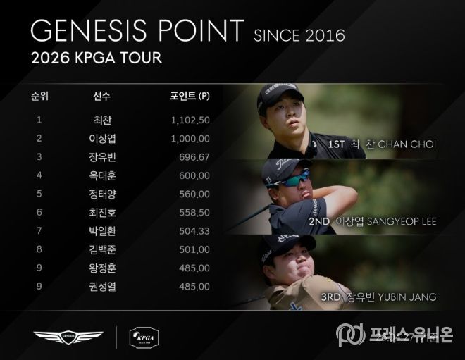 최찬은 ‘2026 우리금융챔피언십’에서 최종합계 13언더파 271타로 우승해 제네시스 포인트 1,000 포인트를 추가한 1,102.50 포인트로 단숨에 제네시스 포인트 1위에 올라섰다. 최찬이 제네시스 포인트 1위에 위치한 것은 2022년 투어 입성 이후 최초다.