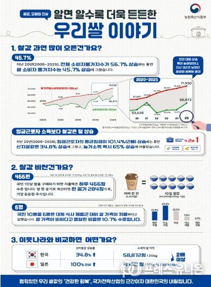 쌀은 ‘주식’으로, 쌀 적정 가격을 통해 소비자는 든든한 주식을 공급받고, 농업인은 안정적으로 농사지을 수 있는 기반을 조성할 수 있다. 정부는 농업인과 소비자 모두에게 안정적인 적정 쌀값이 유지되도록 수급관리에 최선의 노력을 다할 계획이라고 전했다.