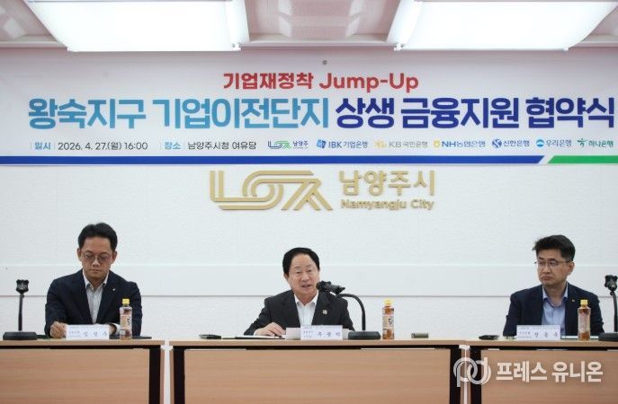프레스유니온 강찬희 기자 | 남양주시는 27일 왕숙신도시 개발로 이전이 필요한 기업의 안정적 재정착을 지원하기 위해 ‘왕숙신도시 기업재정착 점프업(Jump-up) 상생금융’ 업무협약을 체결했다고 밝혔다.