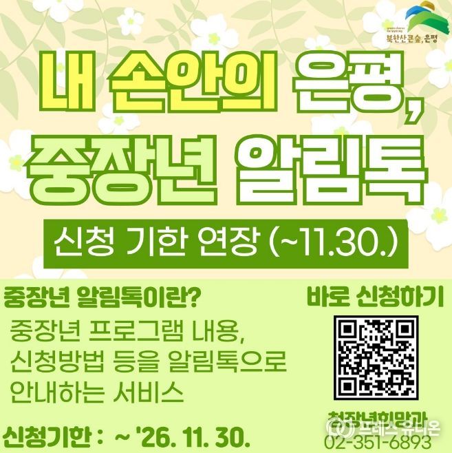 프레스유니온 강찬희 기자 | 서울 은평구는 중장년층의 정보 접근성을 높이고 프로그램 참여 기회를 확대하기 위해 ‘내 손안의 은평, 중장년 알림톡’ 서비스 신청 기간을 연장한다고 밝혔다.