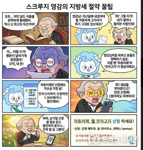 프레스유니온 강찬희 기자 | 청양군이 스마트폰 환경에 익숙한 군민들을 위해 친숙한 캐릭터를 활용한 웹툰 ‘스크루지 영감의 지방세 절세 꿀팁’을 제작하고, 자동이체 및 전자고지 신청 독려에 나섰다.