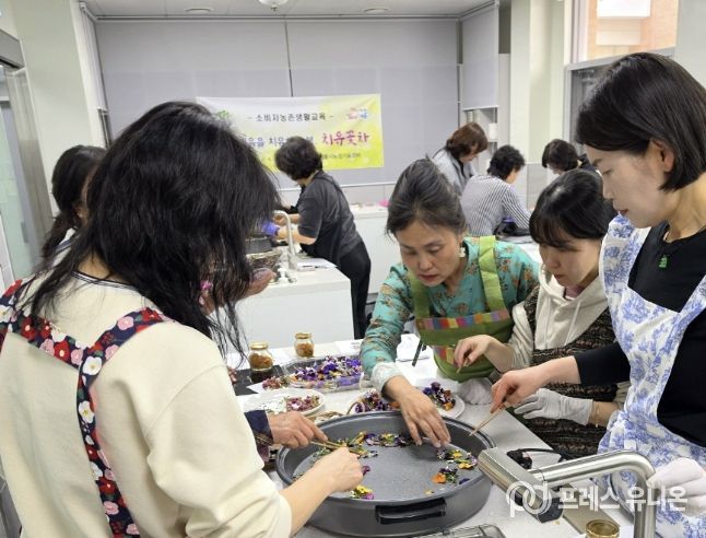 농업기술센터 누리집을 통해 모집된 16명의 교육생은 꽃차 전문가 연정삼 대표의 지도로 봄꽃과 제철 농산물의 성분과 효능, 차 문화 이론을 배우고 실습을 통해 다양한 가공법과 차 제조 기술을 익혔다.