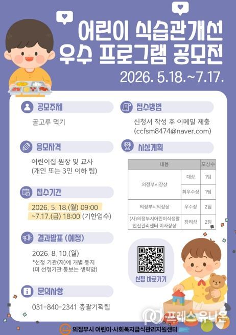 프레스유니온 김성길 기자 | 의정부시가 운영하는 의정부시 어린이‧사회복지급식관리지원센터는 어린이 보육시설을 대상으로 5월 18일부터 7월 17일까지 ‘어린이 식습관 개선 우수 프로그램 공모전’을 개최한다.