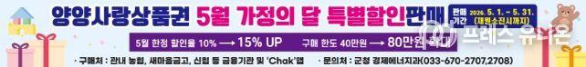 프레스유니온 강찬희 기자 | 양양군이 5월 가정의 달을 맞아 군민들의 경제적 부담을 덜고 침체된 지역 상권을 살리기 위해 양양사랑상품권 특별 할인 판매를 실시한다고 밝혔다.