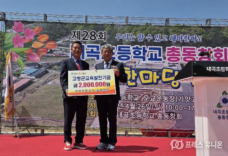 프레스유니온 강찬희 기자 | 내곡초등학교 총동창회(회장 문수열)에서 4월 26일(일) 가얏고 정원에서 개최된 ‘제28회 내곡초등학교총동문회 화합한마당축제’에서 지역의 교육 발전과 인재 양성을 위해 사용해 달라며 지난해에 이어 교육발전기금 200만원을 기탁했다.