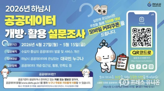 프레스유니온 김성길 기자 | 하남시는 시민과 기업, 연구기관 등 다양한 수요자의 의견을 반영해 공공데이터 개방 및 활용을 확대하고자 ‘2026년 하남시 공공데이터 설문조사’를 실시한다고 밝혔다.