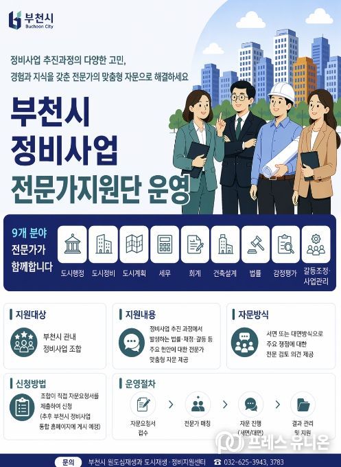 프레스유니온 김성길 기자 | 부천시는 정비사업 추진 과정에서 발생하는 법률·재정·갈등 등 주요 현안에 대한 전문 자문을 지원하기 위해 ‘정비사업 전문가지원단’을 구성해 운영한다고 지난 28일 밝혔다.