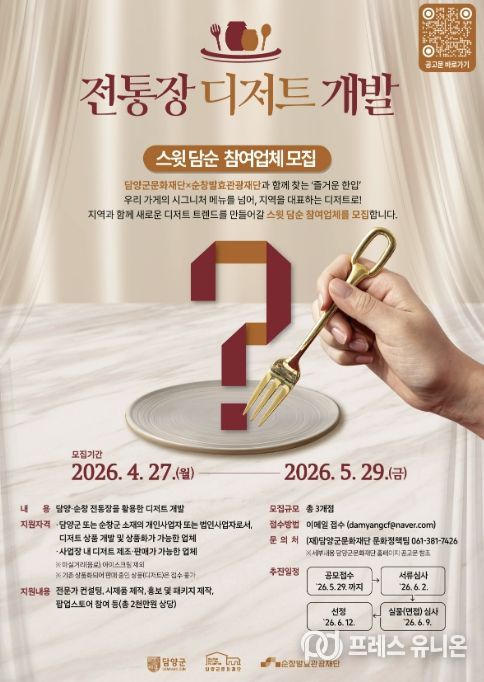 프레스유니온 강찬희 기자 | 담양군문화재단이 순창발효관광재단과 함께 지역 전통장을 활용한 디저트 개발 프로젝트 ‘스윗 담순’ 참여업체를 모집한다.