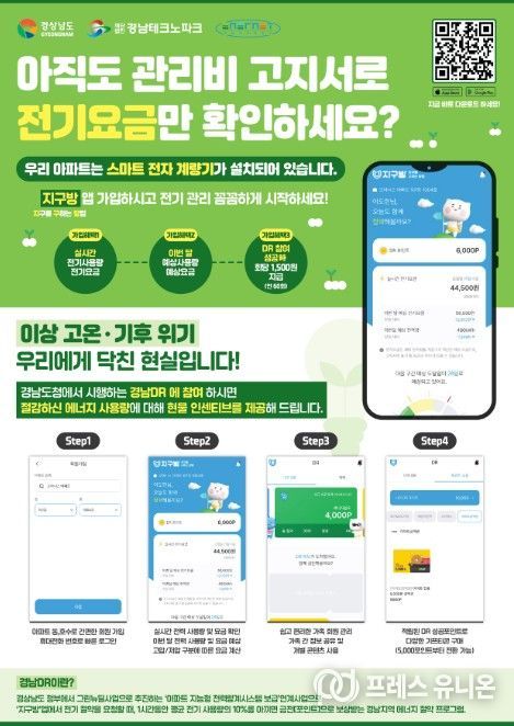 참여를 희망하는 도민은 경남DR 앱 서비스 운영업체인 헤리트의 ‘에첼’ 또는 에너넷의 ‘지구방’ 모바일 앱을 통해 간편하게 가입할 수 있다. 해당 앱에서는 실시간 전기사용량과 예상 요금 확인은 물론, 사용 패턴 분석과 절감 실적에 따른 인센티브 내역 등을 확인할 수 있다.
