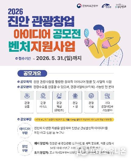 프레스유니온 강찬희 기자 | (사)진안군관광협의회(이사장 이재동)가 지역 관광자원을 활용한 창의적인 아이디어를 발굴하고 실질적인 사업화를 지원하기 위해 ‘2026 진안 관광창업 아이디어 공모전’을 개최한다.