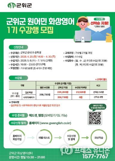 프레스유니온 강찬희 기자 | 군위군은 관내 초·중학생의 영어 능력 향상과 사교육비 부담 완화를 위해 ‘1:1 원어민 화상영어’ 프로그램 1기 수강생을 4월 30일까지 선착순 모집한다고 밝혔다.