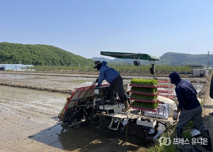 프레스유니온 강찬희 기자 | 경산시 자인면 울옥리 신호철 농가는 27일 자인면 원당들 일원 6ha에 올해 첫 모내기를 실시했다.