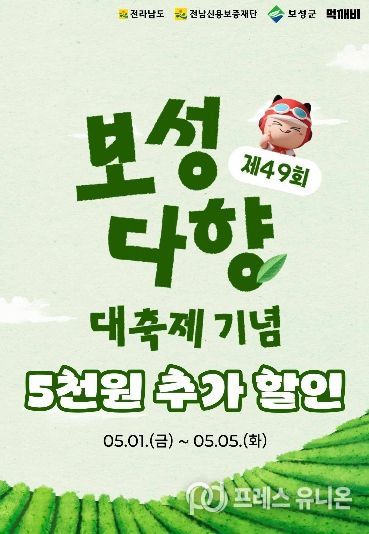 프레스유니온 강찬희 기자 | 보성군은 제49회 보성다향대축제를 맞아 5월 1일부터 5일간 공공배달앱 ‘먹깨비’를 활용한 추가 할인 행사를 진행한다고 밝혔다.