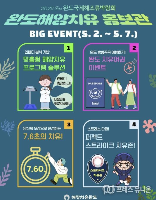 프레스유니온 강찬희 기자 | ‘2026 Pre 완도국제해조류박람회’ 개최 기간(5.2~5.7) 동안 완도만의 해양치유 콘텐츠를 선보이는 ‘해양치유 홍보관’을 운영한다.