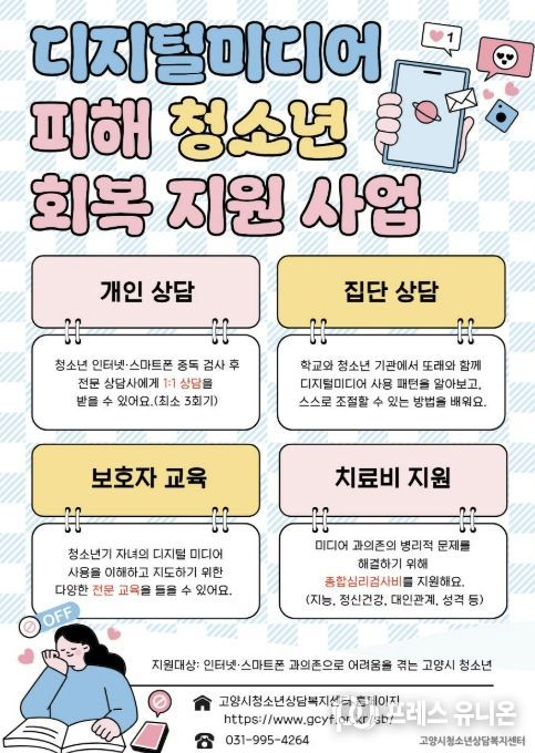 프레스유니온 김성길 기자 | 고양시청소년재단 산하 고양시청소년상담복지센터는 디지털 유해환경에 의한 청소년의 디지털 과의존 및 사이버 도박 등의 사회문제를 예방하고 치료하기 위해 오는 5월부터 12월까지 ‘디지털미디어 피해 청소년 회복 지원 사업’을 운영한다고 밝혔다.
