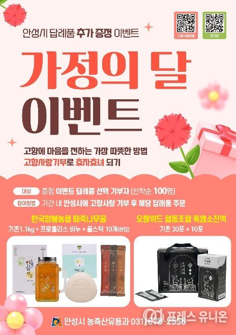 프레스유니온 김성길 기자 | 안성시는 오이데이와 5월 가정의 달을 맞아 고향사랑기부제 참여 확대와 지역 농산물 소비 촉진을 위해 ‘오이데이 이벤트’와 ‘가정의 달 이벤트’를 추진한다고 밝혔다.