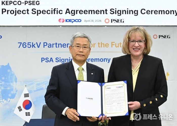 프레스유니온 강찬희 기자 | 한국전력이 4월 28일 서울 양재동 한전 아트센터에서 미국 에너지기업 PSEG社와 765kV 초고압 송전망 사업 협력을 위한 계약을 체결했다.