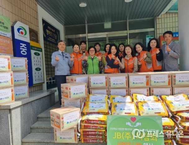 JB㈜ 임원 배우자 모임인 다담회는 이날 지역 이웃을 위해 라면 50박스와 쌀(10kg) 50포 등 약 400만 원 상당의 생필품을 천안시자원봉사센터에 기탁했다.