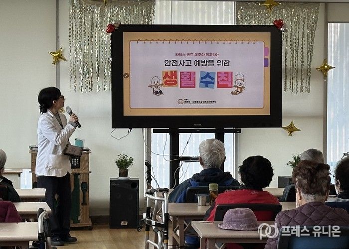 이번 교육은 일상생활에서 발생할 수 있는 안전사고 예방을 주제로, 기본 생활 수칙 안내와 함께 인공지능(AI) 트로트 음악에 맞춘 라텍스 밴드 생활 체조 활동으로 구성됐다. 참여자들은 음악에 맞춰 체조를 따라 하며 자연스럽게 신체활동에 참여하고, 퀴즈를 통해 교육 내용을 쉽고 재미있게 익히고 있다.