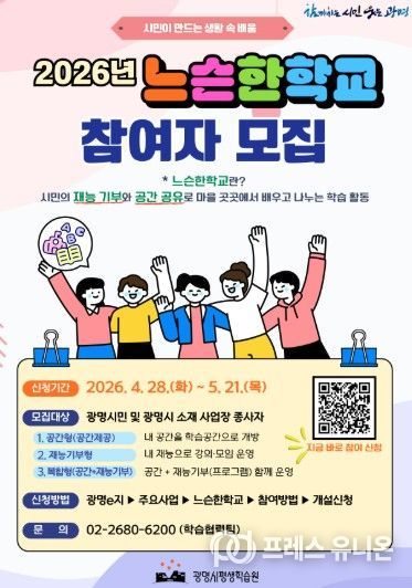 프레스유니온 김성길 기자 | 광명시가 시민이 직접 가르치고 배우는 시민참여형 평생학습 프로그램 ‘느슨한학교’ 신규 운영자를 오는 5월 21일까지 모집한다.