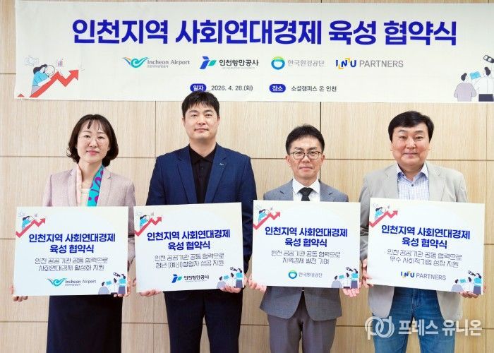 프레스유니온 강찬희 기자 | 인천국제공항공사는 사회적 기업 등 인천지역 사회연대경제를 활성화하기 위해 인천소재 공공기관 및 인천대학교 창업지원단과 ‘인천지역 사회연대경제 육성을 위한 상호협력 업무협약’을 체결했다고 밝혔다.
