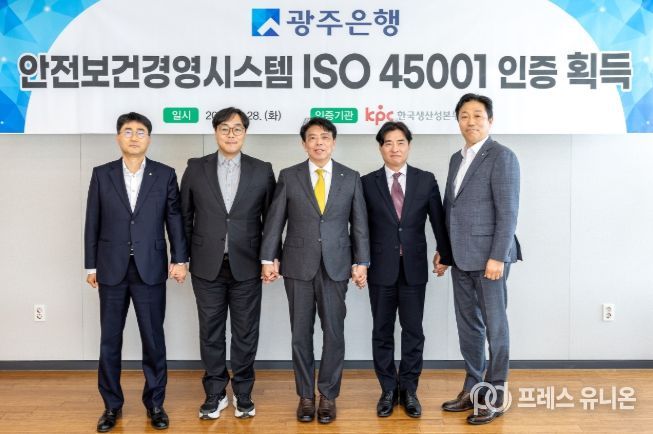 프레스유니온 강찬희 기자 | 광주은행(은행장 정일선)은 28일 광주은행 본점에서 정일선 광주은행장과 강장진 한국생산성본부인증원장 및 주요 관계자들이 참석한 가운데, 안전보건경영시스템 국제표준인 ‘ISO 45001’ 인증 수여식을 개최했다고 밝혔다.