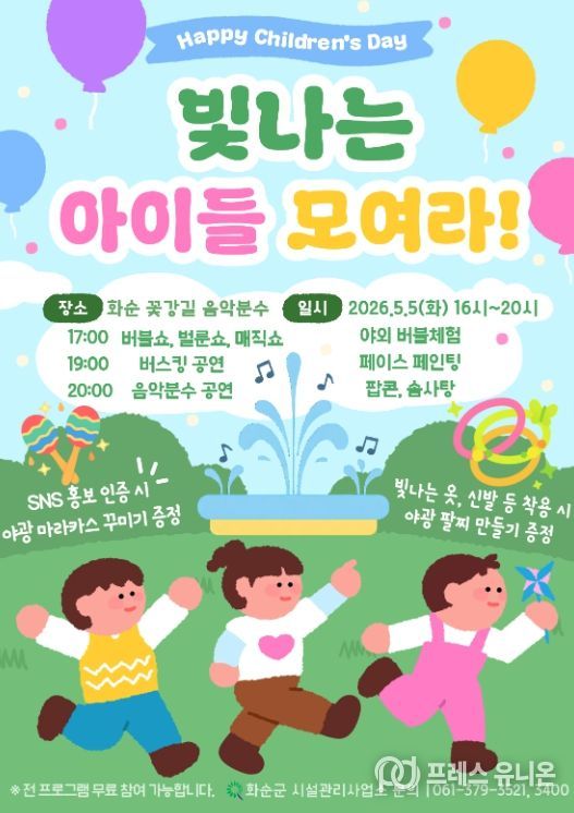 프레스유니온 강찬희 기자 | 화순군은 어린이날을 맞아 아이와 가족이 함께 즐기는 대규모 체험형 축제를 마련해 ‘아동친화도시’의 면모를 한층 강화한다고 밝혔다.