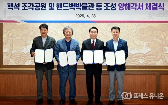 인천광역시는 4월 28일 인천시청 대접견실에서 조각가, ㈜시몬느, 블루코어PFV㈜와 ‘핵석 조각공원과 핸드백 박물관·핵석 전시관 조성’을 위한 양해각서를 체결했다.