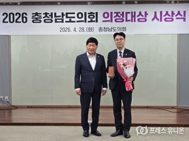 프레스유니온 강찬희 기자 | 충청남도의회 정병인 의원(천안8·더불어민주당)이 고위험 임산부 지원을 위한 정책 연구모임 운영 공로를 인정받아 28일 열린 ‘2026 충청남도의회 의정대상’ 정책연구 부문을 수상했다.