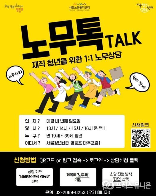 넷째 주 일요일에 진행되는 ‘노무톡(Talk)’은 청년들의 권익 보호를 위해 마련된 프로그램이다. 임금 체불, 부당 해고, 직장 내 괴롭힘 등 근로 현장에서 발생하는 고충을 전문 노무사와 1:1로 깊이 있게 상담할 수 있다. 평일에 시간을 내기 힘든 사회초년생과 아르바이트 청년들에게 든든한 버팀목이 된다.