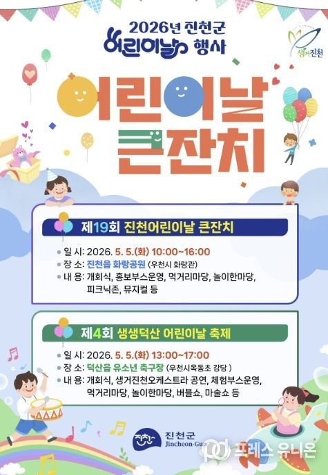 프레스유니온 김성길 기자 | 충북 진천군은 제104회 어린이날을 맞아 5월 5일 진천읍 화랑공원과 덕산읍 유소년축구장 두 곳에서 어린이날 기념행사를 개최한다고 밝혔다.