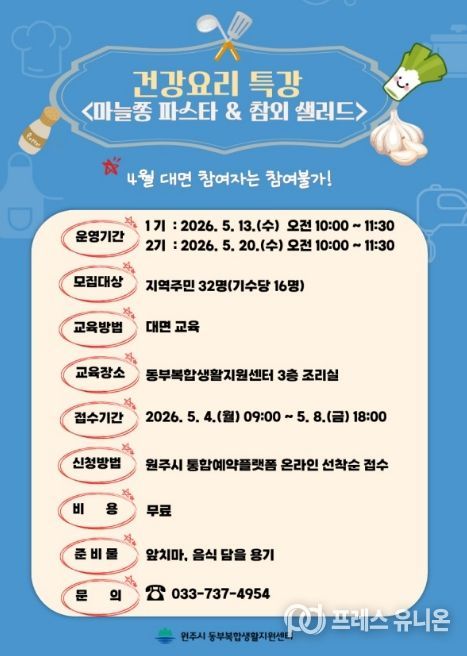 프레스유니온 강찬희 기자 | 원주시 동부복합생활지원센터는 다음 달 4일부터 ‘마늘쫑 파스타·참외 샐러드 만들기’ 건강 요리 특강 프로그램 참여자를 모집한다.