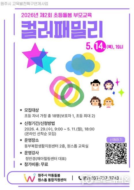 프레스유니온 강찬희 기자 | 원주시 아동돌봄 원스톱통합지원센터는 다음 달 14일 오후 7시, 관내 초등학생 자녀와 보호자를 대상으로 가족 간의 이해와 소통을 돕는 부모교육 프로그램 ‘컬러패밀리’를 운영한다.